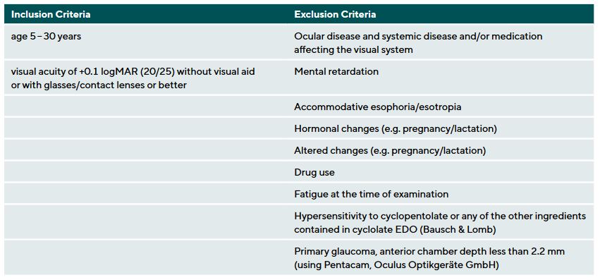 Refraction represents an essential part of the eye examination. It is beneficial for the detection of refractive errors that, uncorrected or inappropriately corrected, lead to poor visual outcomes. It is well known that unrecognized, uncorrected strabismus and anisometropia are the most common causes of amblyopia in children worldwide.1,2 Furthermore, besides cataract and age-related macular degeneration, uncorrected refractive error is one of the most common causes of blindness and vision impairment in adults.3 Accordingly, different techniques have been evolved to determine the proper refraction and correction for optimal vision. These include objective and subjective methods, such as autorefraction and subjective refraction, with or without the additional use of cycloplegics. Relevant scientific and practical findings on these different methods are known. In optometric practice, the gold standard for evaluating the refractive error and the associated correction is subjective refraction.4,5 If subjective refraction is performed without cycloplegia, it is well known that myopia can be overestimated, and hyperopia underestimated.6 The findings on non-cycloplegic autorefraction are identical.7–15 Results of studies on children and young adults aged 7 to 21 years show that the difference between non-cycloplegic and cycloplegic spherical equivalents is statistically significantly higher in hyperopes than in emmetropes and myopes.16,17 A commonly discussed reason is accommodation.18 Particularly in pediatric populations, the accommodative system is very robust.19 If accommodation is not adequately relaxed, measured values may fluctuate.20 This may lead to inaccurate refractive measurements.19 Different methods exist to ensure accommodation control. These include the fogging technique, which is realized by optical lenses or integrated in autorefractometers.21–23 Despite the discussion about non-invasive techniques for accommodation control, cycloplegic measurement is preferred.24,22 Despite all the techniques available, cycloplegic refraction has become the gold standard to assess refractive errors in uncooperative subjects, children and adults up to 50 years, as well as in epidemiological studies.25–27,14,22,17,28,11