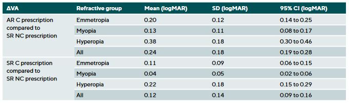 In emmetropes and myopes, C and NC refraction did not change visual acuity. For hyperopes, visual acuity reduced by 0.38 ± 0.18 logMAR and 0.22 ± 0.18 logMAR when comparing AR C prescription and SR C prescription to SR NC prescription, respectively.