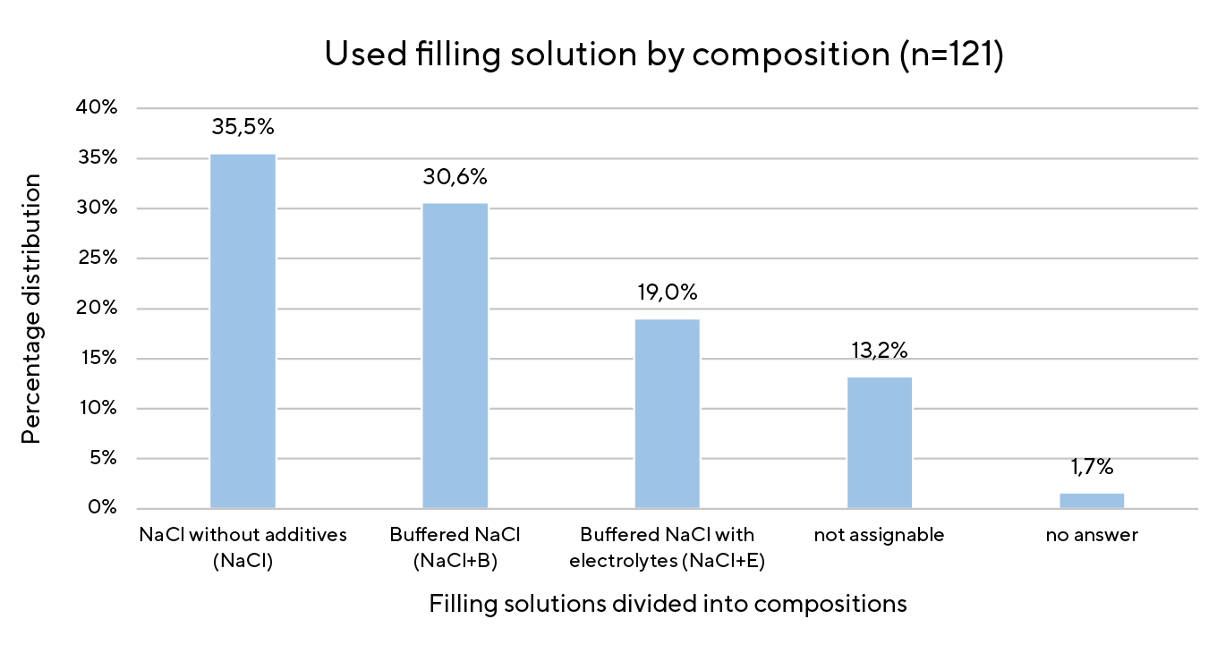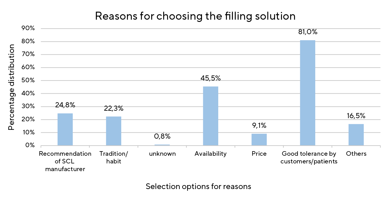 When asked about the main reason for choosing a particular filling solution, most participants cited good patient tolerance (81.0 %) as the primary factor, followed by availability (45.5 %). Price played a minor role (9.1 %). Figure 4 shows the percentage distribution of responses; multiple answers were possible.