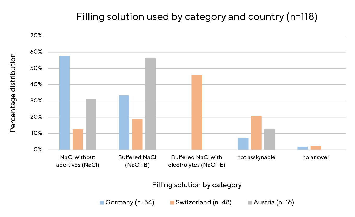 However, notable differences emerge when the country distribution percentages are considered across the product categories. This is shown in Figure 3 when the columns are split into the different countries (Germany = blue; Switzerland = red; Austria = grey). Only Swiss SCL practitioners use NaCl + E. NaCl without additives is the most often referenced in Germany while NaCl + B is the most common filling solution in Austria. The three additional countries (Canada, Italy, Namibia) were not included in Figure 3, as the figure focuses on the distribution within the German-speaking market.