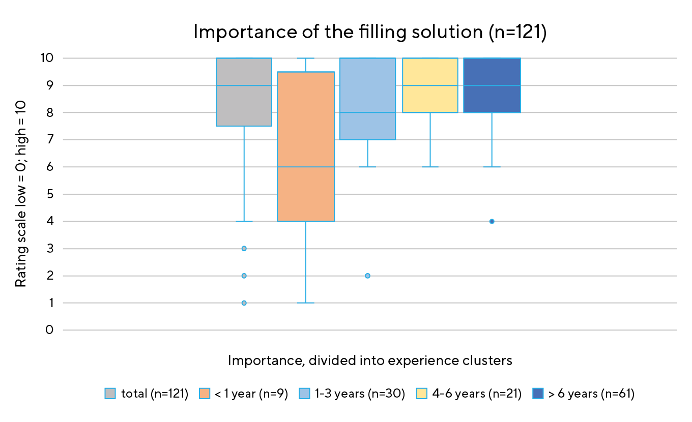 When asked about their approach to managing patient complaints, participants ranked a predefined fourstep trouble shooting sequence according to personal preference. Across the entire sample, the filling solution was most commonly placed in third position (Table 3), with second and third place appearing interchangeable. When the results were stratified by experience level, only minor variations in ranking patterns emerged.