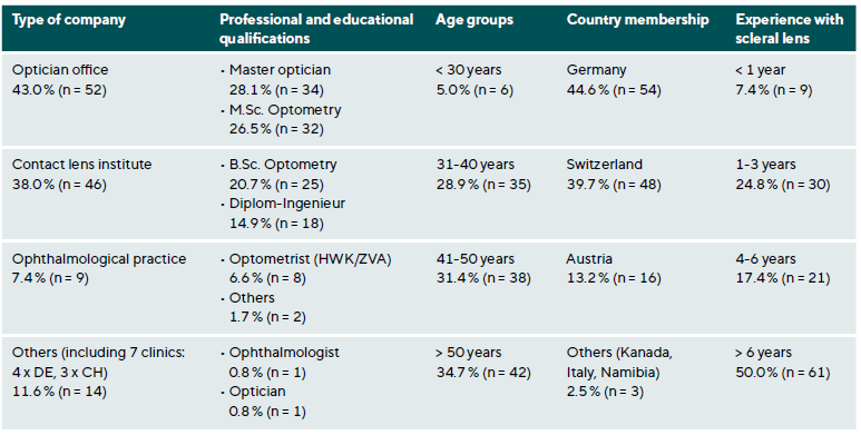 A total of 146 institutions responded, 121 of those provided complete datasets for statistical analysis. Table 1 presents an overview of the participants‘ demographics. A total of 50.4 % (n = 61) of participants have been fitting SCL for more than six years. The remaining 49.6 % are distributed across three groups: those with less than one year, one to three years, and four to six years of experience with SCL. The majority of the sample is employed in optician offices (n = 52) or contact lens institutes (n = 46) and the distribution between Swiss (n = 48) and German fitters (n = 54) is relatively even.