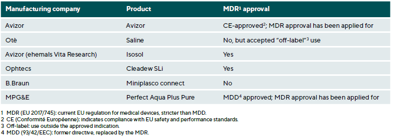 As part of this study, the five main suppliers of filling solutions were contacted. They were asked whether their respective product is approved for the intended use as a filling solution for scleral lenses. While some of the products are officially approved for this specific use, others are used off-label. The responses are summarised in Table 4.
