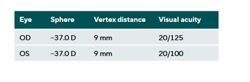Rigid gas permeable contact lenses (Ascon, Hecht Contactlinsen GmbH) were fitted. Due to the increased retinal image size, visual acuity was improved compared to correction with glasses. (Table 2)