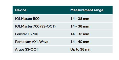 IOLMaster 500 (Carl Zeiss Meditec AG), IOLMaster 700 (Carl Zeiss Meditec AG), and Pentacam AXL-Wave (Oculus Optikgeräte GmbH) failed at their respective device-specific maximum values (due to the length of the reference-arm). The authors noted that the measurement with the Argos SS-OCT was possible, despite the official measurement range supports only measurements up to 38 mm.10