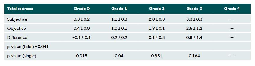Table 3 lists the objective findings of bulbar redness. The differences between the subjective classification and the objective measurements are shown in Table 4.
