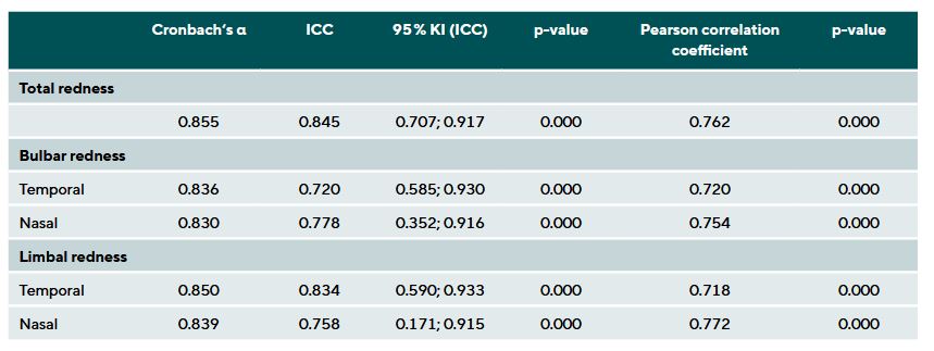 Results. With regard to the images obtained using the software, the mean grade of findings was 1.3 ± 0.3, with 24 % of the results being assessed as grade 0, 48 % as grade 1, 14 % as grade 2 and grade 3. The subjective findings resulted in a mean grade of 1.5 ± 0.3. 17 % were assessed as grade 0, 45 % as grade 1, 19 % as grade 2 and 5 % as grade 3. The results of the subjective and objective classification of temporal and nasal bulbar redness are not statistically different. In contrast, the results of temporal and nasal limbal redness are statistically different, with the subjective findings within grade 1 being statistically significantly higher than those of the objective findings. The mean dispersion of the objective classifications is 11 %, that of the subjective 31 %.