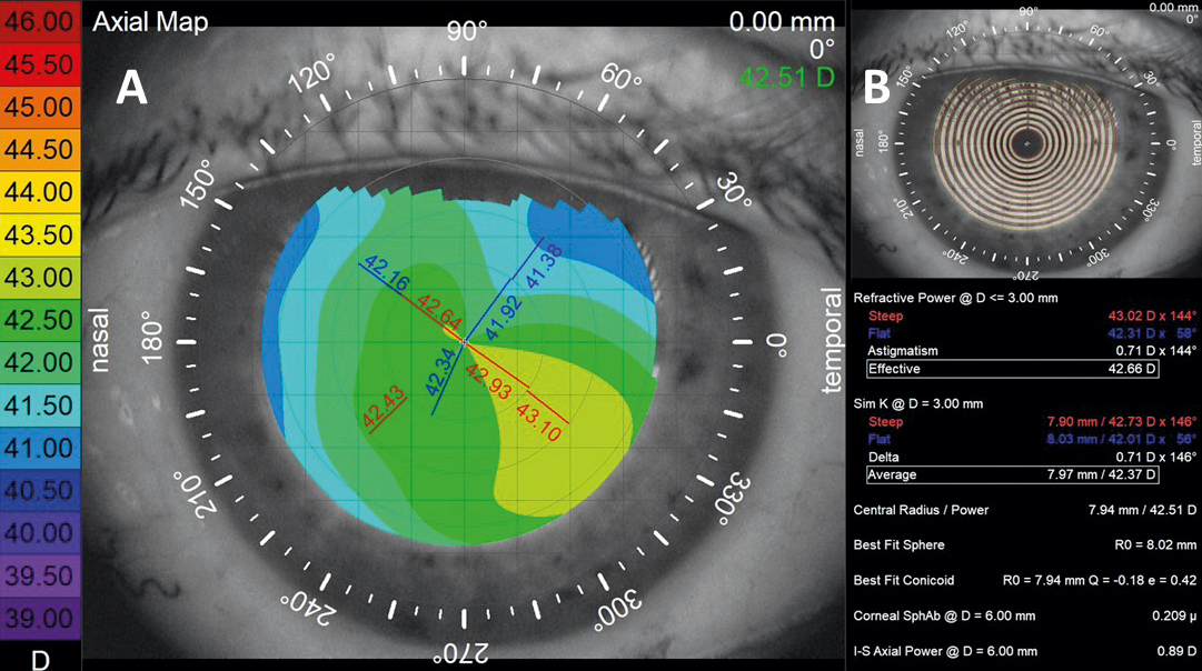 Corneal topography (Figure 2) showed a corneal astigmatism (−0.71 D 60°), which was less than the refractive astigmatism of −9.00 D.