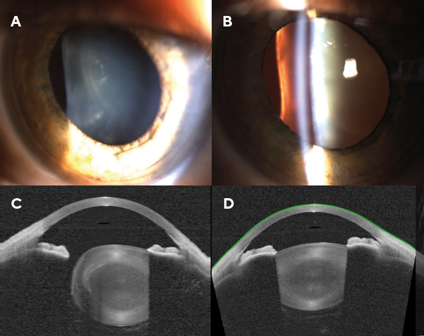In the present case, a refractive laser treatment for the cornea was possible.4 Corneal thickness was sufficient and the topography was regular. However, it should be noted that in this case, immense astigmatism would have to be ablated in a nearly spherical cornea to achieve a good refractive result. The induced astigmatism will interfere with the development of a cataract later in life. In cataract surgery, the induced corneal astigmatism would have to be neutralized with a toric intraocular lens. However, since correcting the astigmatic refractive error alone, as with glasses, would not result in a significant improvement in visual acuity due to the presence of higher-order aberrations, both options were ruled out.