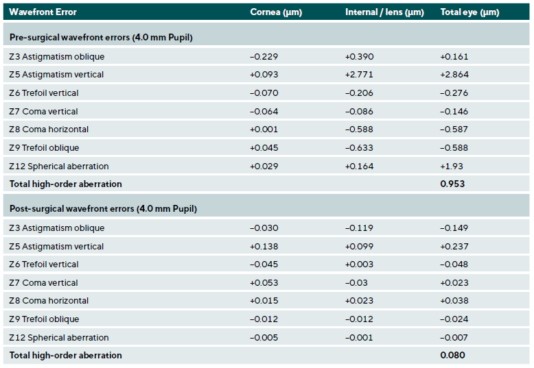 Conclusion: In most cases, severe lens astigmatism with significant anisometropia and extremely high aberration cannot be satisfactorily corrected with glasses or contact lenses. However, this case report shows that it is possible.