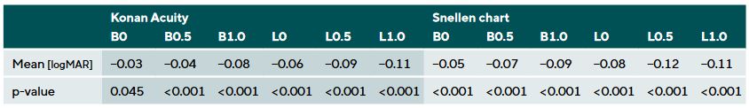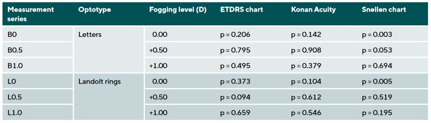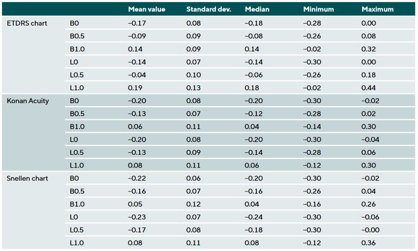 According to ISO/TR 19498, two sets of optotypes are considered to be equivalent if the visual acuity differs on average by a maximum of 0.05 logMAR and the standard deviation of the visual acuity of the tested optotype is not more than 1.5 times the standard deviation of the visual acuity of the Landolt rings.8 In relation to the present study, this means that all differences up to 0.05 logMAR found between any two conditions of can be considered equivalent. Paragraph 6 of ISO/TR 19498 also addresses the significance of the differences, which can be determined using the equations described there.8 When applied to this study, it can be seen that the differences between the B0 samples of both apps do not exceed 0.05 logMAR and the standard deviations are also within the 1.5 times limit. Only when comparing the Konan Acuity app with the ETDRS chart with letters and full correction the p-value is above the 5 % significance level; all other differences are therefore to be regarded as statistically significant. It should be noted that the conditions specified in the ISO/TR are intended to serve as a reference for this study but cannot be fully implemented. ISO/TR 19498 describes a procedure for comparing optotype with the standard visual acuity sign: the Landolt ring. Each optotype must be presented 120 times to every test subject which would have exceeded the intention and the time frame of this study by far. Furthermore, the study is intended to compare two apps against the popular ETRS charts containing the same optotypes, and not so much to compare indivdual optotypes against the standard Landolt ring. In addition, it should be noted that this study considers differences averaged across several test subjects and not differences averaged across repeated measurements on one and the same eye. In conclusion, it can be said that, when using capital letters for eyes with high and with fully corrected vision, the apps are comparable to the ETDRS charts, and the differences can be regarded as tolerable.