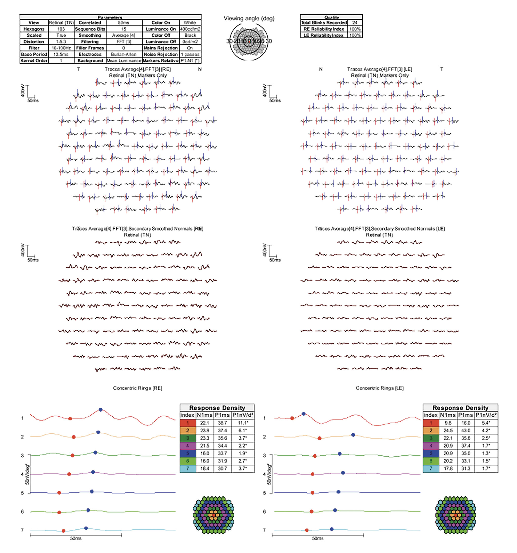consistent with her reduced central vision. The multifocal mfERG showed diffusely depressed outer retinal responses, worse centrally OU and worse in the left eye compared to the right eye (figure 2).
