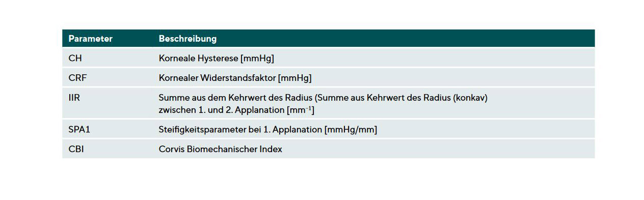 Conclusion. Examination of corneal biomechanics using air-puff tonometry is a new method to detect possible early changes in the tissue. The biomechanical parameters, especially those of Scheimpflug-based air-puff tonometry, reveal changes before they are visible on topography or tomography. This is of great importance in refractive surgery, but also in the management of keratoconus.
