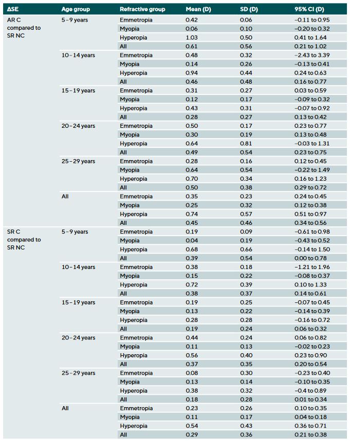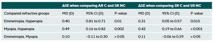 Results. When comparing AR C and SR NC, deviations in SE were largest in hyperopes (∆SE = 0.74 ± 0.57 D; 95% CI: 0.5 – 0.97 D) compared to emmetropes (∆SE = 0.37 ± 0.21 D; 95% CI: 0.24 – 0.45 D) and myopes (∆SE = 0.25 ± 0.32 D; 95% CI: 0.12 – 0.38 D). When comparing SR C and SR NC, deviations in SE were largest in hyperopes (∆SE = 0.54 ± 0.43 D; 95% CI: 0.36 – 0.71 D) compared to emmetropes (∆SE = 0.23 ± 0.26 D; 95% CI: 0.10 – 0.35 D) and myopes (∆SE = 0.12 ± 0.17 D; 95% CI: 0.04 – 0.18 D).