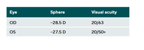 An axial length greater than 26 mm is associated with a 25 % increased risk of having a visual acuity of less than 20/40 at the age of 75 years. With an axial length exceeding 30 mm, the risk increases to 90 %.1 Which numbers can axial length reach in extreme cases? The following case describes a female patient with an extremely high ocular axial length.