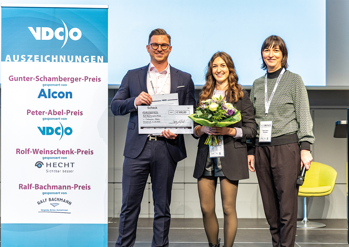 Auszeichnung für Catharina Schuhs innovative Studie zur Versorgung von Patienten mit trockenen AugenIm Rahmen des diesjährigen Kongresses SICHT.KONTAKTE 2025 wurde der Ralf-Bachmann-Preis in der Kategorie bestes Poster: „Best Practice and Innovation“ an Catharina Schuh für ihre herausragende Arbeit verliehen. Das prämierte Poster mit dem Titel „Regionale Marktrecherche zur Diagnostik und Behandlung des trockenen Auges aus der Kundenperspektive“ untersuchte die regionale Verfügbarkeit von Diagnostik und Behandlungsmöglichkeiten für das trockene Auge und beleuchtete, wie transparent entsprechende optometrische Dienstleistungen für Kundinnen und Kunden tatsächlich sind.