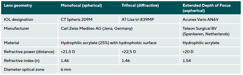 Three different IOLs with different lens geometries were measured to determine the imaging quality. A monofocal, a trifocal and an extended depth of focus (EDOF) IOL were used (Figure 2). All IOLs were focussed in the model eyes for the test distance of 6 m. The corresponding characteristics are shown in Table 1.