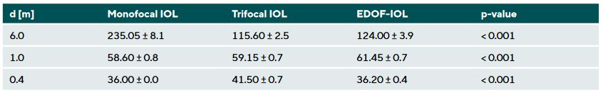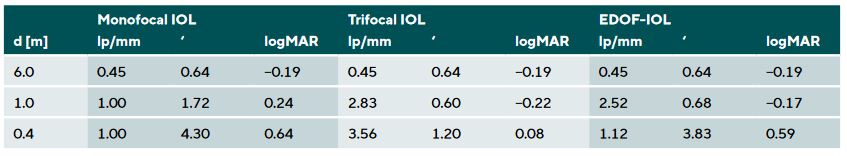 Results. All IOLs (monofocal/trifocal/EDOF) achieved a resolution of 0.445 lp/mm at a distance of 6 m, as well as