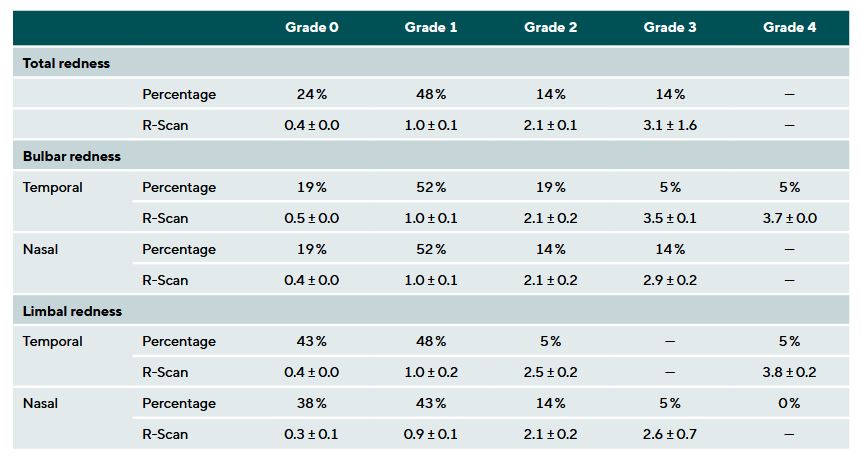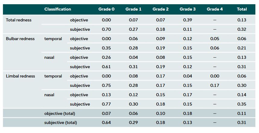 Table 3 lists the objective findings of bulbar redness. The differences between the subjective classification and the objective measurements are shown in Table 4.