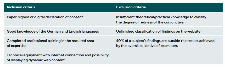 A total of 135 experts were contacted, 35 of whom wanted to support the study. Inclusion criteria for examiners were, for example, a qualification in optometry or ophthalmology with completed training, as well as more than three years of professional experience. Further inclusion and exclusion criteria are shown in Table 2. Of 35 applicants, 20 experts qualified according to these criteria. 70 % of the examiners were male and 30 % were female, with an average age of 40.2 ± 13.9 years. The study complies with ICH-GCP standards and did not require the approval of an ethics committee. The qualifications of the participants ranged from at least a bachelor’s degree in ophthalmic optics/optometry up to the highest qualification of PhD or MD. The survey on personal and professional data revealed that 75 % of the participants worked in the field of contact lenses, 10 % in optometry with a focus on the anterior segment of the eye, and 5 % in research. The average patient frequency was 12 ± 14 patients per week.
