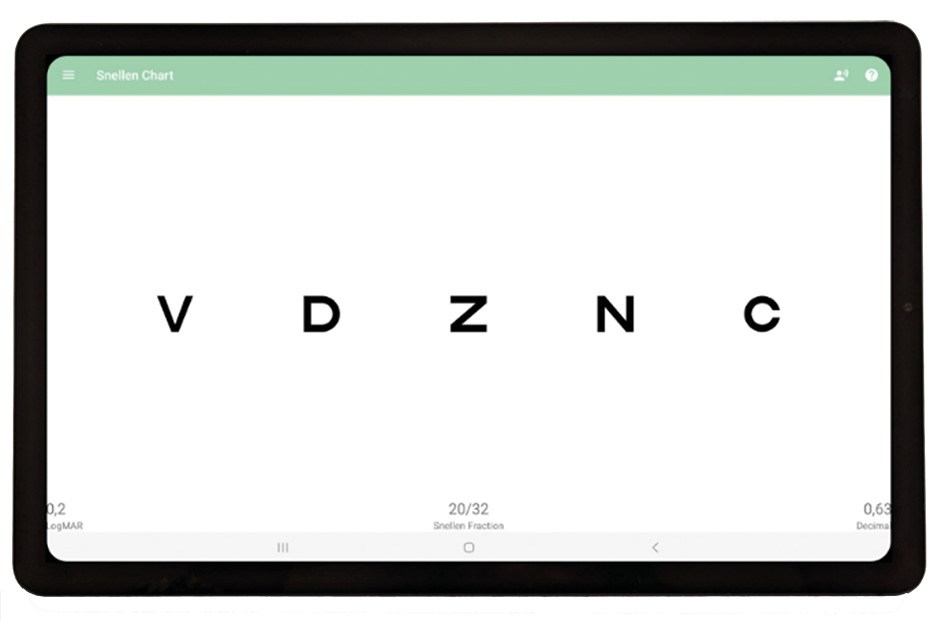 The Konan Acuity application was selected for the iOS operating system and the Snellen chart application for the Android operating system. Both app designs resemble in many respects the specifications of the DIN standards. The Konan Acuity app was installed on an Apple iPad (9th generation, 10-inch screen diagonal) and the Snellen chart app on a Samsung Galaxy Tab S6 lite (10-inch screen diagonal). Before conducting the measurements, the test distance for the screen resolution required by DIN EN ISO 10938 3 was tested which was achieved at a distance of ≥ 133 cm for the iPad and at a distance of ≥ 155 cm for the Samsung Galaxy Tab. At a test distance of 4 m, the pixel size is 0.083‘ for the iPad and 0.097‘ for the Samsung Galaxy Tab. From a distance of 40 cm, typical for determining near vision acuity, a pixel on the tablets would appear 3-4 times larger than permitted by the standard. The optotypes used in the respective app were also checked for compliance with the DIN standard in terms of their dimensions and their distance from each other. The optotype sizes are within the standard specified by the DIN. The distances between the individual optotypes of the Konan Acuity app are each the size of an optotype, as it is the case with the ETDRS charts. With the Snellen chart app, the minimum distances required by DIN EN ISO 8596 are only matched at visual acuity level 0.5 or