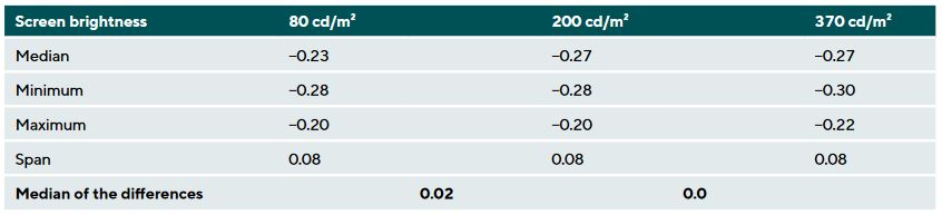 Table 3 shows that the visual acuity values determined at different screen brightness levels (80, 200 and 370 cd/m2) do not differ or differ only very slightly. For example, the difference of 0.02 found at the low brightness setting only corresponds to the visual acuity value of one letter on a logMAR chart and can be easily regarded as a random error. It can therefore be concluded that the screen brightness has no or at most a very small influence as long as it does not exceed the limits allowed in the corresponding DIN EN ISO. Similar findings have also been reported by other authors. Sheedy et al., for example, investigated visual acuity in a luminance range between 45 and 563 cd/m2 and found that, on average, only one letter more is read or there is no difference at all when doubling the luminance, provided Landolt rings are used as optotypes.10